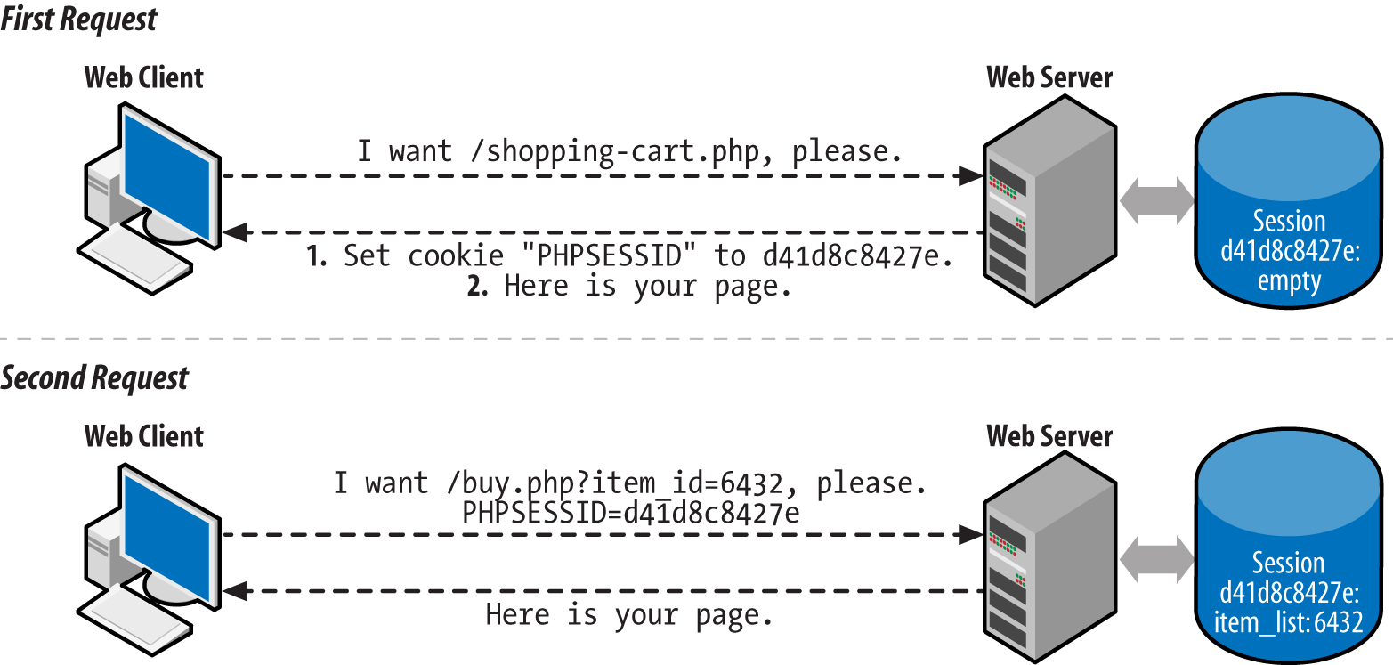 La sessió afegeix la gestió de l'estat a HTTP, emmagatzemant en aquest cas la informació al servidor. Cada visitant té un ID de sessió únic, el qual per defecte s'emmagatzema en una galeta anomenada SESSIONS DE PHP. Si el client no té les galetes actives, l'ID es propaga a cada URL dins del mateix domini. Cada sessió té associat un magatzem de dades mitjançant l'array global $_SESSION, en el qual podem emmagatzemar i recuperar informació.