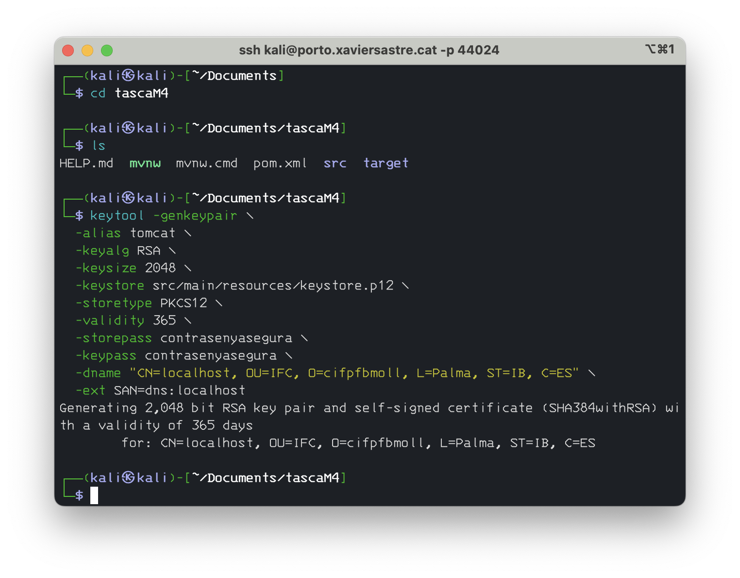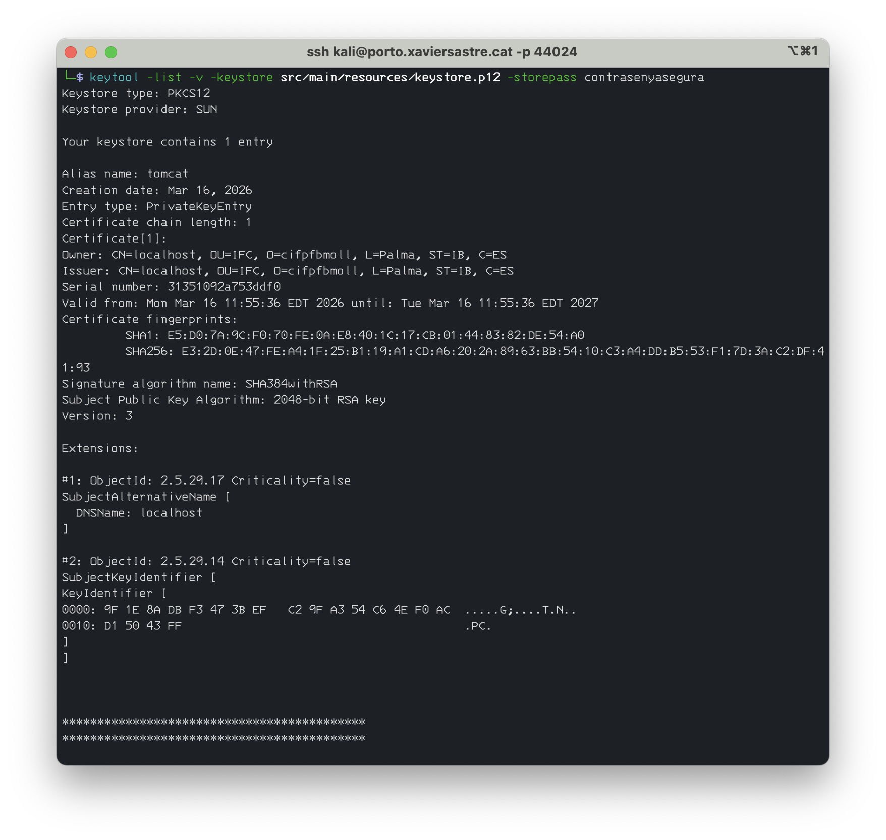 En l'enunciat original es genera server.crt i server.key amb OpenSSL. Tomcat necessita un fitxer keystore (.p12 o .jks). Una alternativa seria crear els fitxers seguint les instruccions originals i després convertir els formats, encara que he optat per utilitzar l'eina nativa de Java keytool