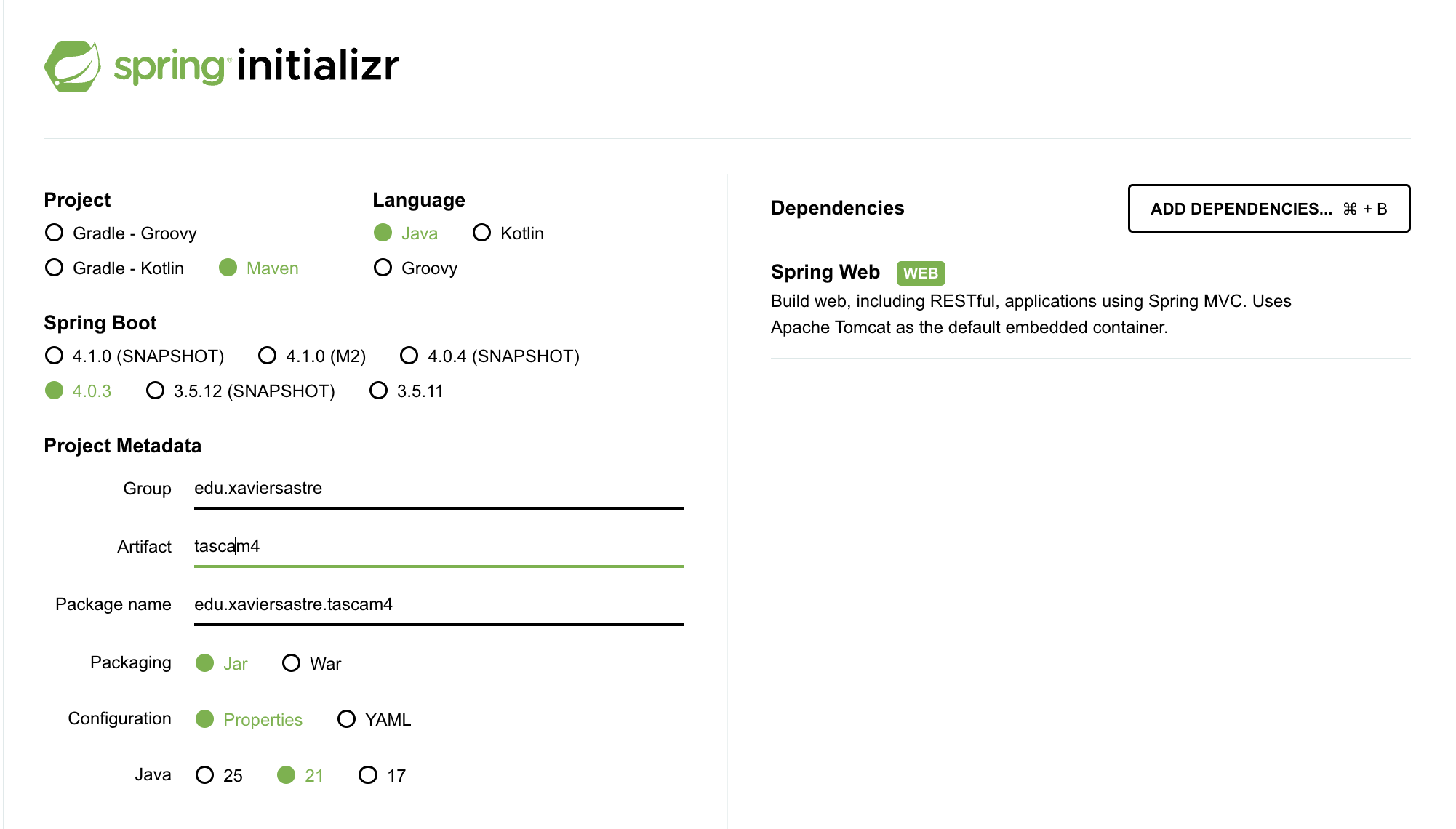 Per al tipus de projecte que necessitem, ens n'hi haurà prou amb marcar la dependència de spring-boot-starter-web a spring-initializr.