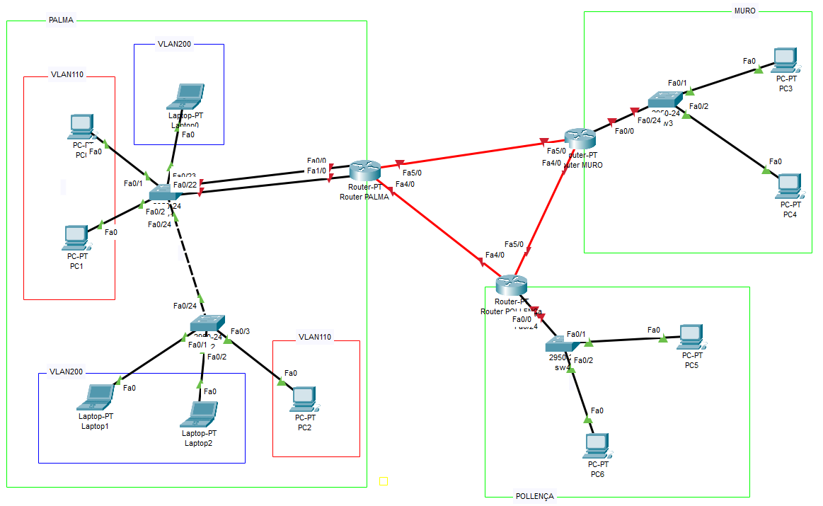 En l’esquema pots observar que hi ha tres xarxes (PALMA, MURO i POLLENÇA) interconnectades a través d’encaminadors. Sen’s demana el següent: