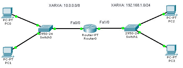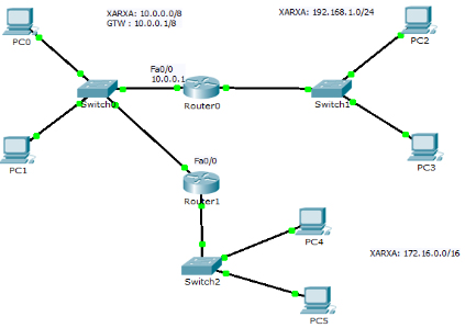 - Implementa amb el Packet Tracer la xarxa plantejada a la imatge.